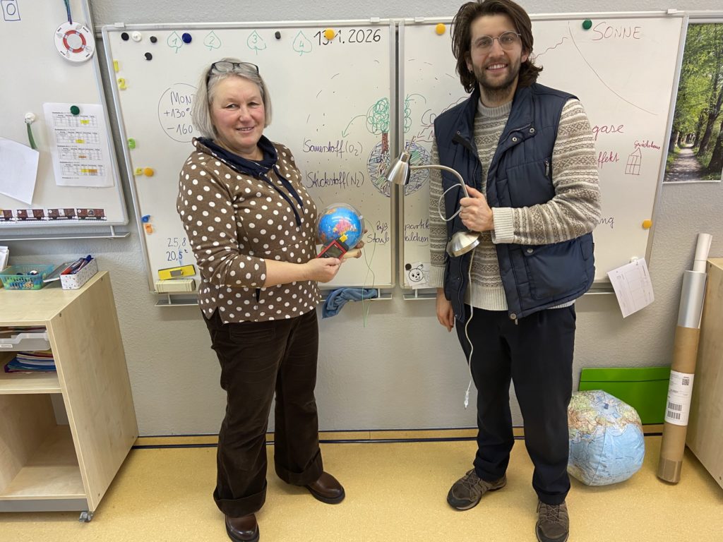 Einblick in den Klassenraum bekam atmosfair-Projektmanager David Grüttner bei seinem Besuch an der Grundschule im sächsischen Technitz. Dort vermittelte die DUA-Pädagogin Silke Schubert den Schülerinnen und Schülern im Unterrichtsmodul „Mein CO₂-Fußabdruck“, wie das Erdklima funktioniert und welche Rolle der Mensch dabei spielt. Anschließend ermittelten die Kinder der vierten Klasse in Kleingruppen, wie viele Treibhausgase sie selbst und ihre Familien verursachen. „Der CO₂-Fußabdruck ist für Kinder sehr anschaulich. Damit verstehen sie schnell, welchen Beitrag sie selbst zur Erderwärmung leisten. Es hat die Klasse überrascht, wie viel CO₂ ein Flug im Vergleich zum eigentlich erlaubten Fußabdruck ausstößt. Wir sind atmosfair sehr dankbar für dieses durchdachte Bildungskonzept,” so Schubert.