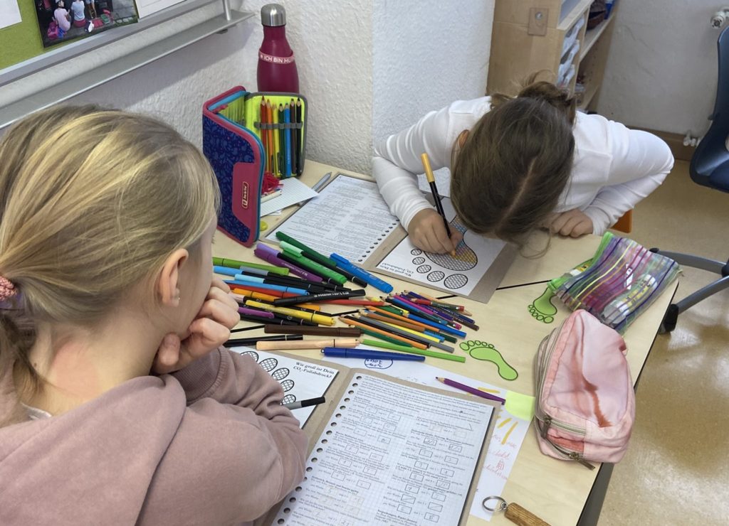 Schülerinnen der Grundschule Technitz ermitteln spielerisch ihren CO₂-Fußabdruck.