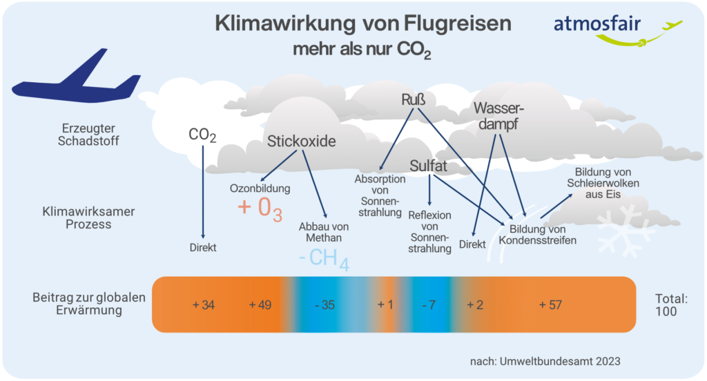 Ein Flugzeugtriebwerk stößt nicht nur CO₂, sondern auch andere klimawirksame Substanzen wie Stickoxide, Wasserdampf und Rußpartikel aus. Letztere sind Kristallisationskerne für Kondensstreifen. Auf Flugniveau in zehn Kilometern Höhe herrschen Lufttemperaturen von minus 40 bis minus 60 Grad Celsius. Dort gefriert der Wasserdampf und lagert sich an die Rußpartikel an. So zieht das Flugzeug eine Spur dicker werdender Streifen hinter sich her. In manchen Fällen bleiben diese Streifen viele Stunden lang am Himmel, wobei sie sich zu großflächigen, schleierförmigen Cirruswolken weiterentwickeln. Dies geschieht jedoch nur unter bestimmten Umständen: