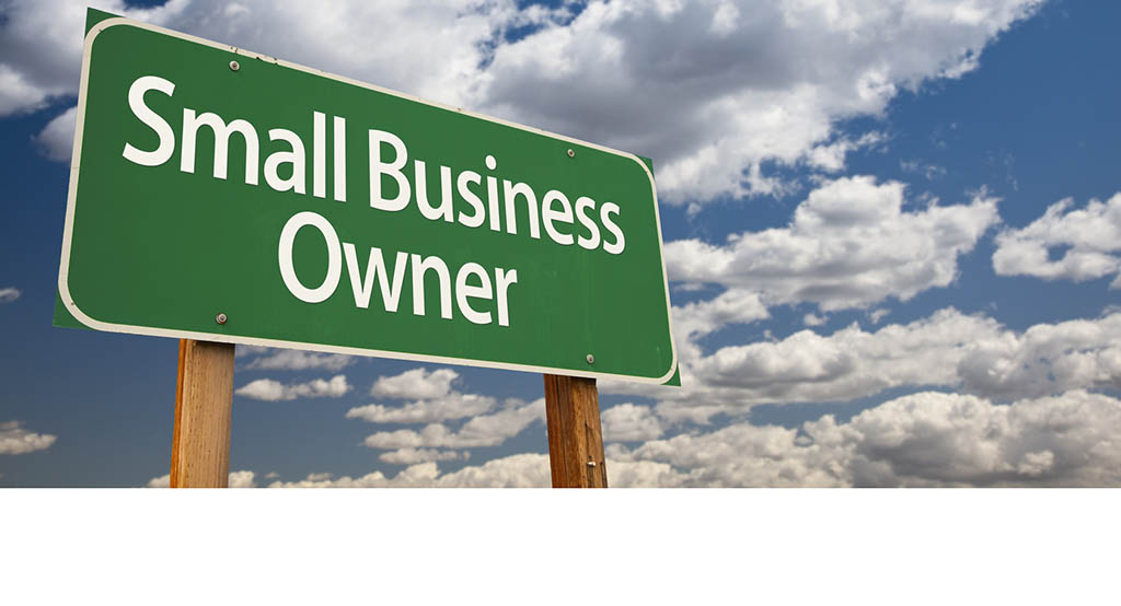 Small Business Owner Green Road Sign with Dramatic Clouds and Sky.