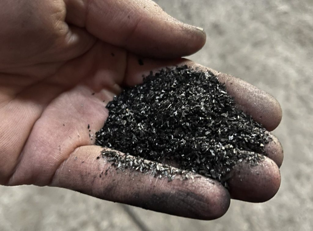 Als Rohstoff für den ganzen Prozess dienen beschädigte Teile von Holzpaletten, die sich nicht mehr wiederverwenden lassen. Bisher landeten sie auf Deponien oder wurden verbrannt. Nun recyceln wir sie in der Pyrolyseanlage. Dabei werden die zerkleinerten Holzschnitzel hohen Temperaturen von mehreren hundert Grad ausgesetzt. Die Hitze spaltet Moleküle auf, wobei Pflanzenkohle zurückbleibt, die anschließend mit lokal gewonnenem Gesteinsmehl vermischt wird.