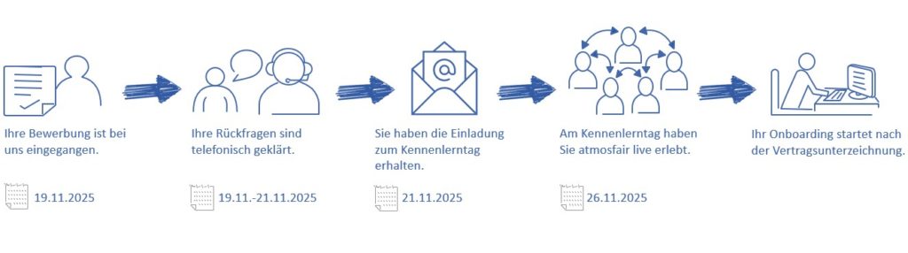 Unser Team und die Arbeit von atmosfair lernen Sie am besten an einem der Bewerber:innentage kennen. Dort stellen wir Ihnen unsere Mission, einzelne Kolleg:innen und Ihre Aufgaben detailliert vor. Sie können an diesem Tag mit allen sprechen, sich das Büro ansehen und alles erfahren, was für Sie wichtig ist. Wir freuen uns auf Sie!