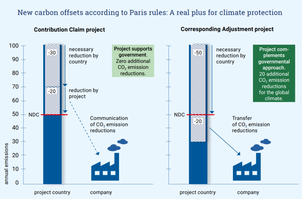 Comparison of CO₂ reductions achieved by a project with a Contribution Claim (CC) and a Project with Corresponding Adjustments (CA). A project with CC supports the host country in meeting its NDC. In the case shown, climate action does not go beyond the NDC. When the host country transfers the CO₂ reductions from the project to a foreign company, it must achieve its NDC entirely through its own measures. The climate action of the CA Project thus goes beyond the host country’s climate target.