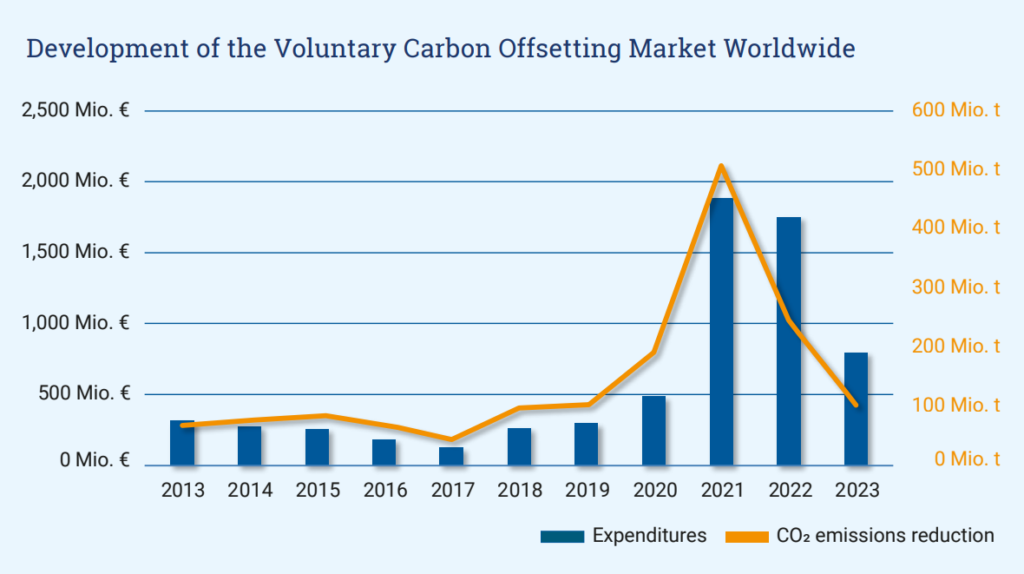 Currently, there is no sign of a resurgence in the voluntary carbon market. In 2023, companies spent 700 million euros on carbon offsetting, significantly less than in the previous two years. In 2021 and 2022, the volume of the global carbon market (also known as the Voluntary Carbon Market, VCM) approached the two-billion-euro mark. The decline may be attributed to negative media coverage in 2023. The volume of CO₂ reductions that were certified (though not necessarily sold) in recent years also decreased over the past three years. This could be a consequence of reduced demand, but it occurred much more slowly than the decline in the volume of credits sold. A different trend emerges when looking at certified reductions that companies applied to their emissions in 2022 through 2024, meaning they “retired.” The volume of these remained nearly constant over the past three years at 180 million metric tons of CO₂ per year (MSCI Carbon Markets 2025). This suggests that companies had already stockpiled sufficient credits in previous years. Consequently, they see no Need to purchase new ones (yet). This could be another reason for the decline in market volume.