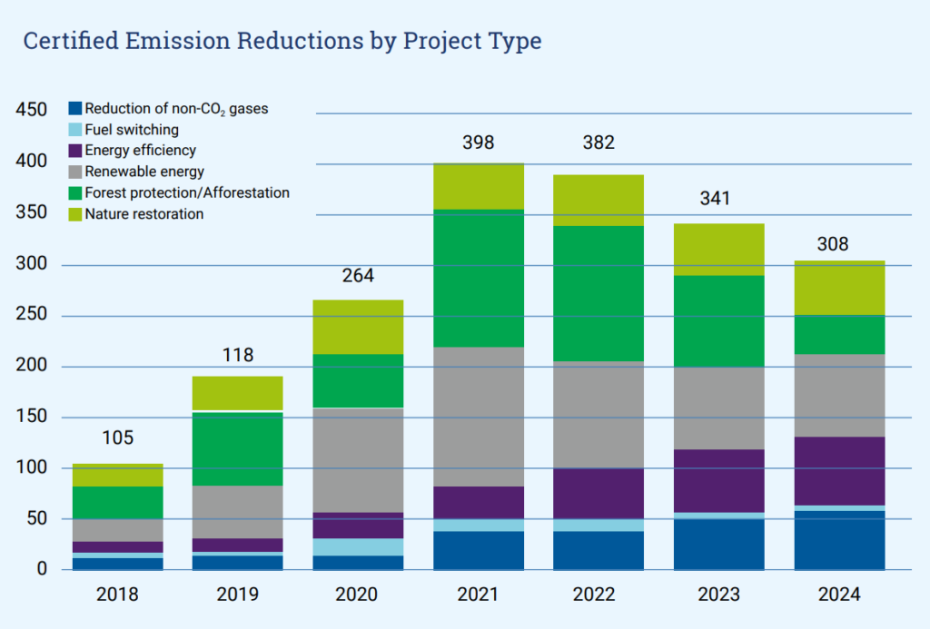 Volume of certified emission reductions in megatons of CO₂. In the voluntary carbon market, the volume of certified reductions has gradually declined since its provisional peak in 2021. Additionally, the volume of CO₂ reductions from forest protection and afforestation projects dropped sharply in 2024, while energy efficiency projects have steadily gained importance (MSCI Carbon Markets 2025).